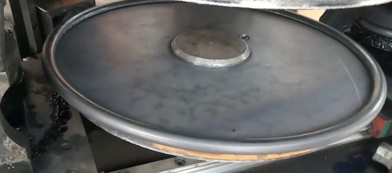 c.初次彎邊:對彎邊輪做了改進(jìn),輪下緣略大于輪上緣,在彎邊的過程中,輪下緣對工件的圓邊也起到了支撐的作用,防止圓邊變形。將工件邊緣先彎成約180o的圓弧。